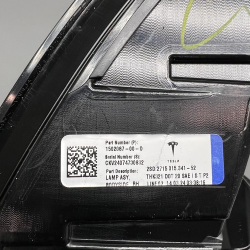 TESLA MODEL Y TAIL LIGHT RIGHT PASSENGER 2020 21 22 23 2024 LED OEM 1502087-00-D NEW PART NUMBER MUST MATCH TO FIT Shipping Regular shipments are shipped with FedEx over size shipments (Bumpers, Hoods, Fenders, Doors) are shipped with a freight companies. Handling time is usually 1 business days. All other packages are shipped by Priority shipping. Payment We accept the following payment methods on ebay:PayPal Please contact us if you have any questions. Returns Please contact us for returns All sales are sold AS-IS with no warranty After item is returned we will refund 100% of the item price or send a replacement if available Item must be returned in original packaging and must be in exact same condition as it was sent out Products must be returned to us in their original condition and in their original packaging.